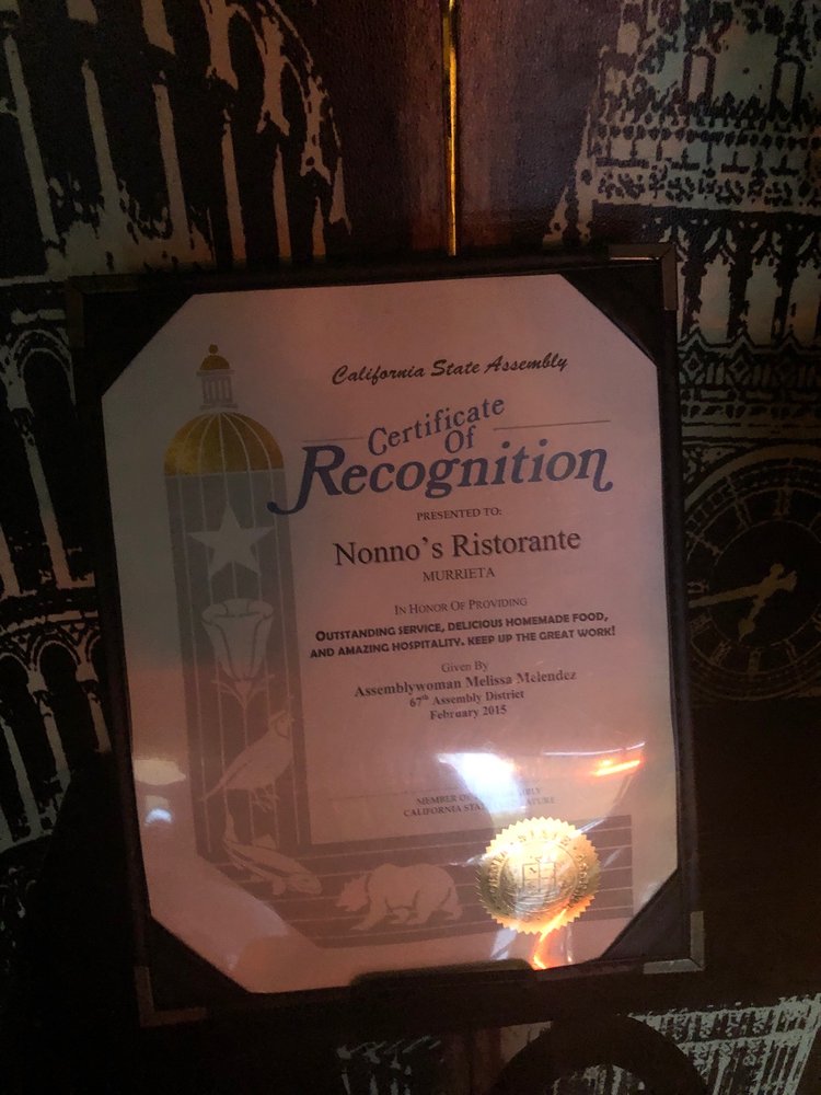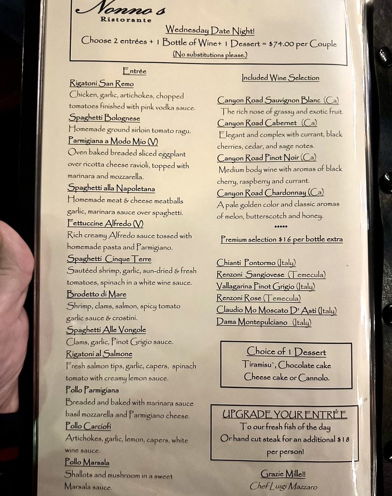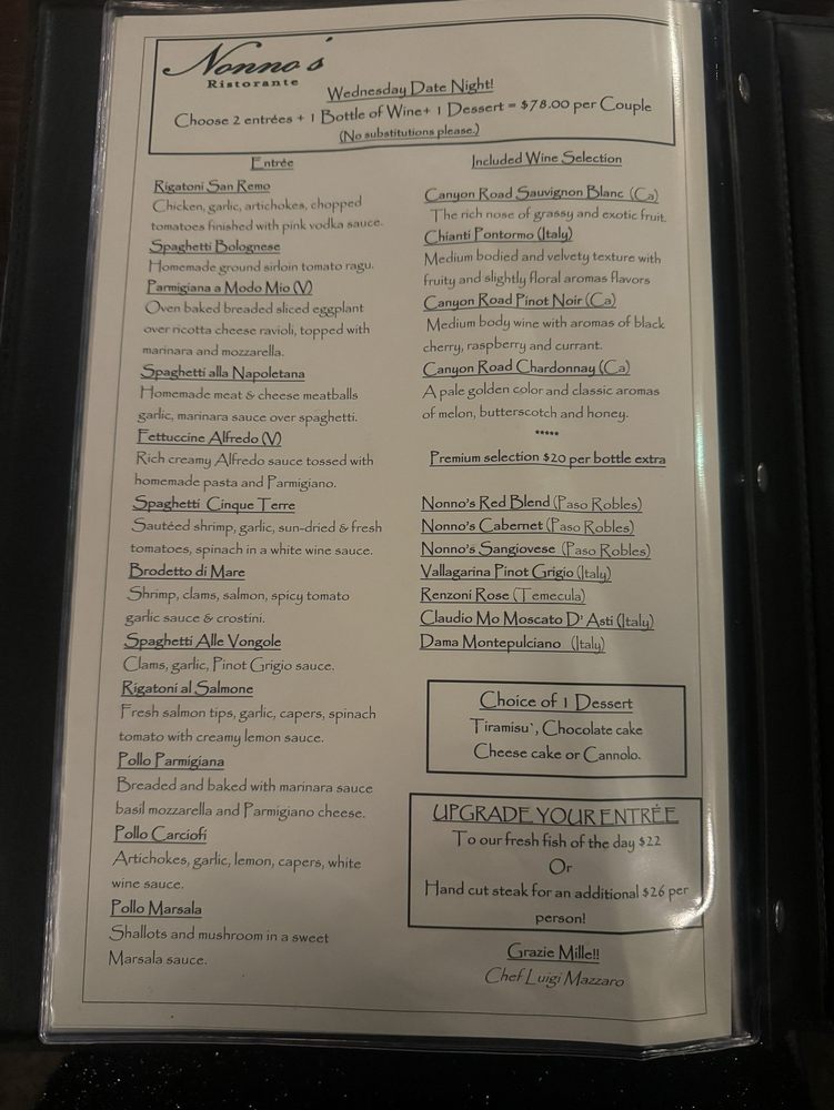 Nonno’s Ristorante, located in Murrieta, CA, is a cozy Italian eatery offering a range of dishes from antipasti to light, healthy options. The menu features classic Italian favorites like Antipasto Italiano and Bruschetta Tradizionale, as well as fresh salads like Caesar Salad and Del Bosco. Customers rave about the homemade gnocchi and the flavorful pepperoni pizza. The restaurant also offers a variety of options for dietary preferences, including vegan and vegetarian choices. With a full bar, happy hour specials, and a welcoming, intimate atmosphere, Nonno’s Ristorante is a must-visit for those craving authentic Italian cuisine. Whether you're looking for a casual dinner or a special occasion, this charming restaurant with attentive staff and delicious food is sure to impress.